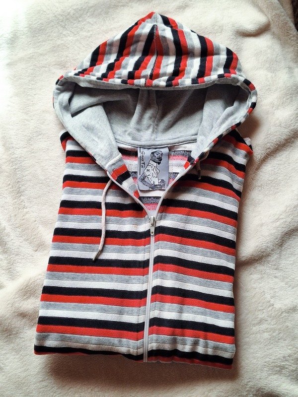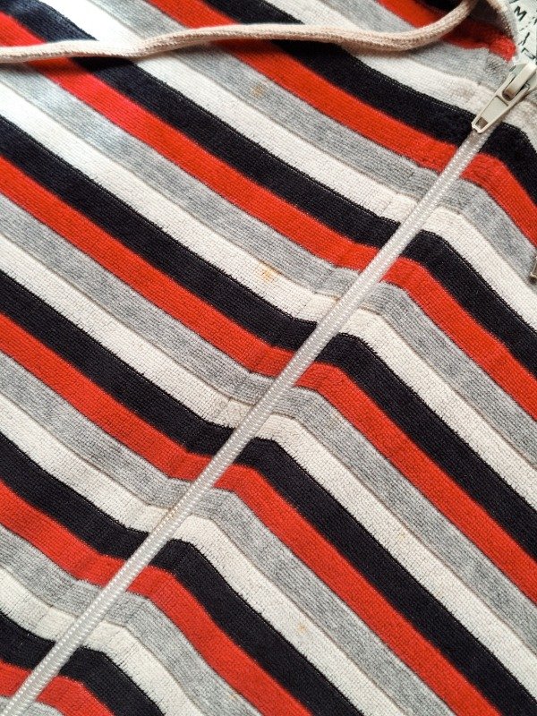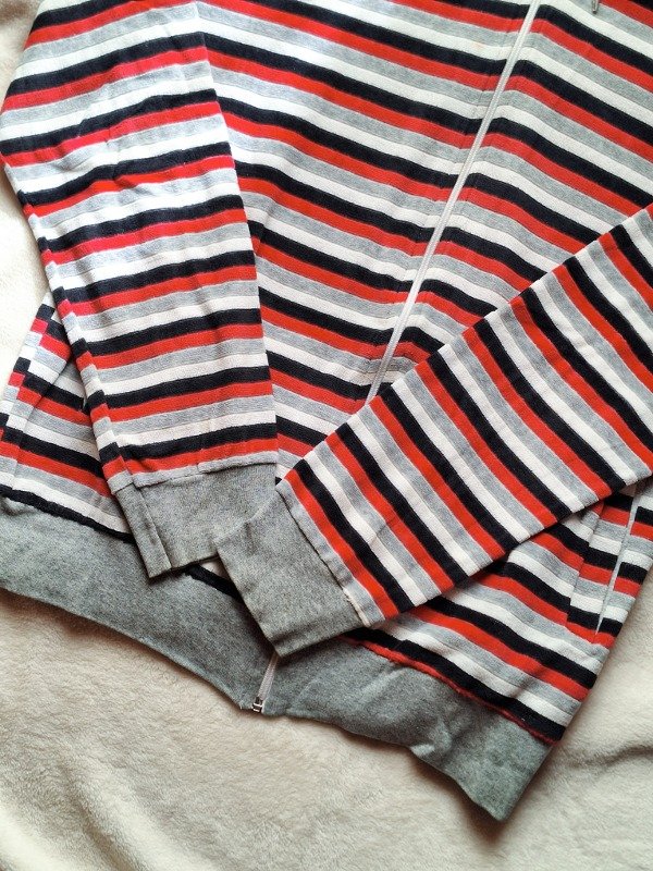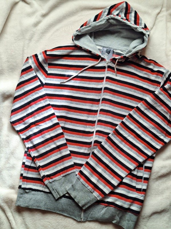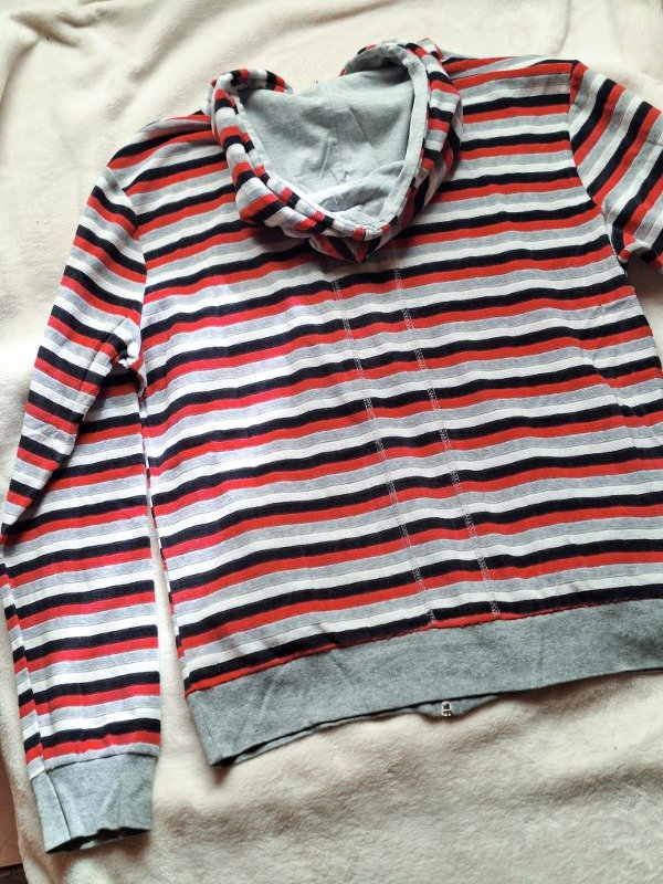 𝗗𝗲𝘀𝗰𝗿𝗶𝗽𝗰𝗶𝗼𝗻: Campera a rayas en tonos blanco, gris, rojo, negro.. con capucha bolsillos, cordón en la capucha para ajustar, ideal para todos los días, la tela es como de toalla..