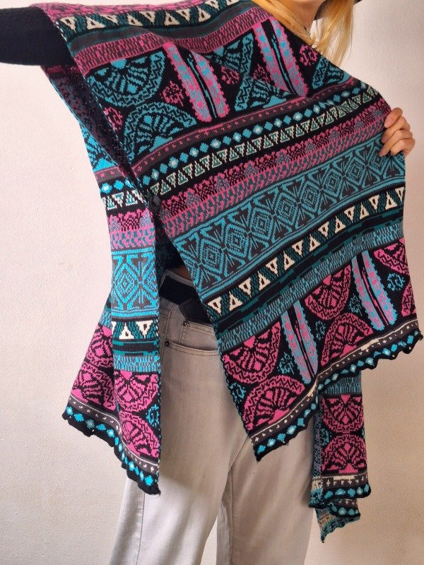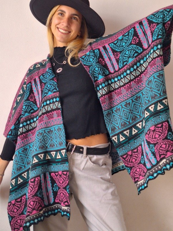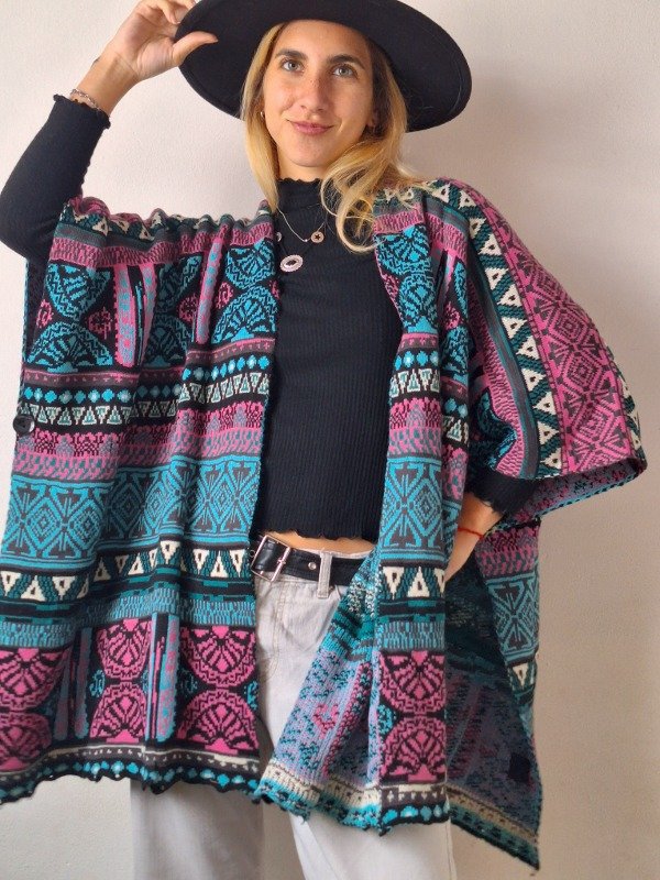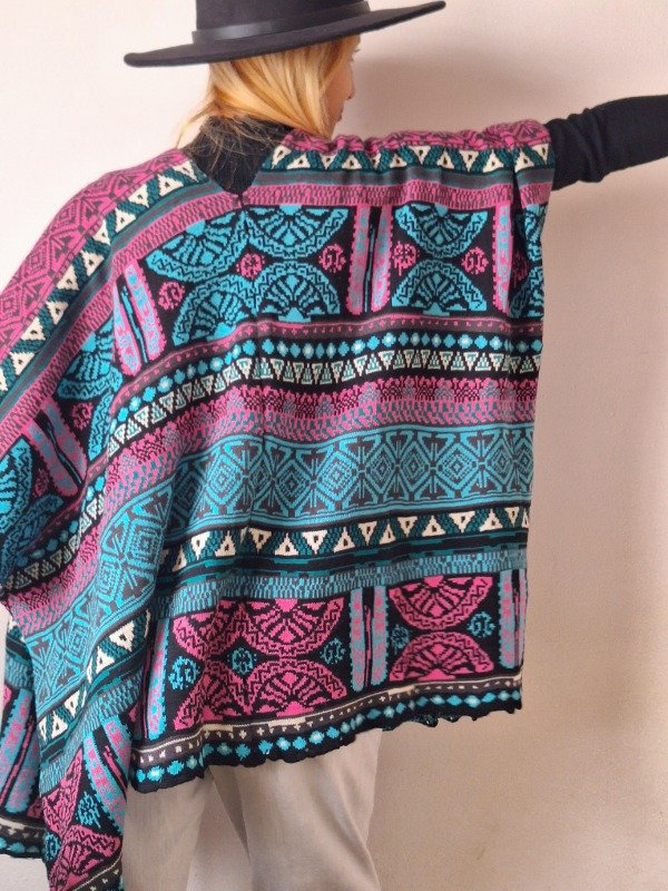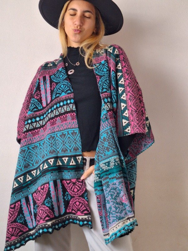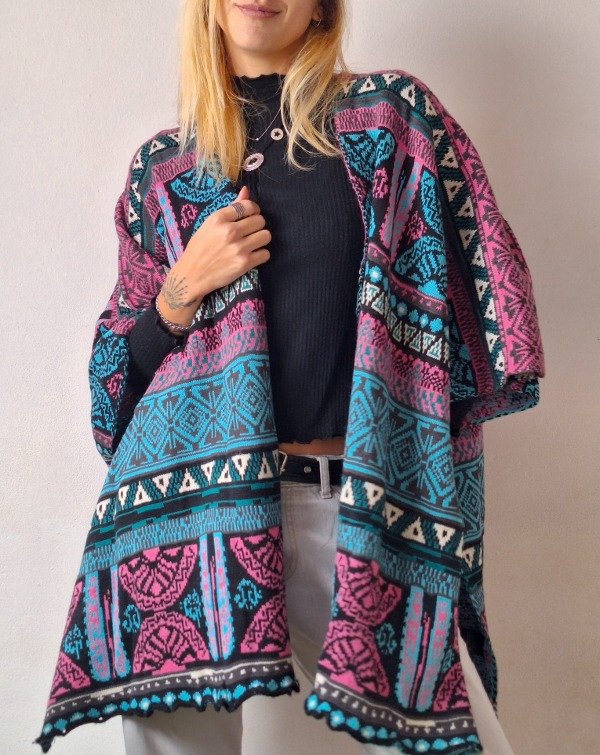 𝗗𝗲𝘀𝗰𝗿𝗶𝗽𝗰𝗶𝗼𝗻: Poncho de colores en tonos celestes y rosas, el modelo es cuadrado, asi que queda estilo capa, y tiene un boton que cierra la manga. Todos los sacos y ponchos las medidas serán aproximadas ya que sede más.