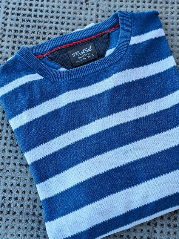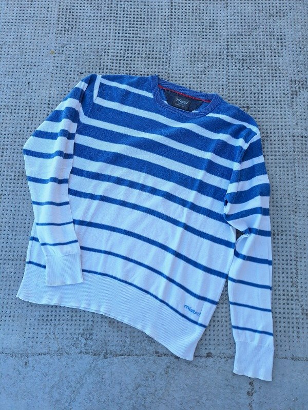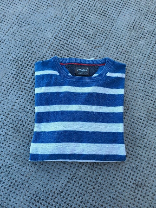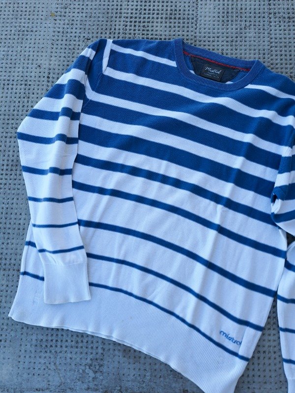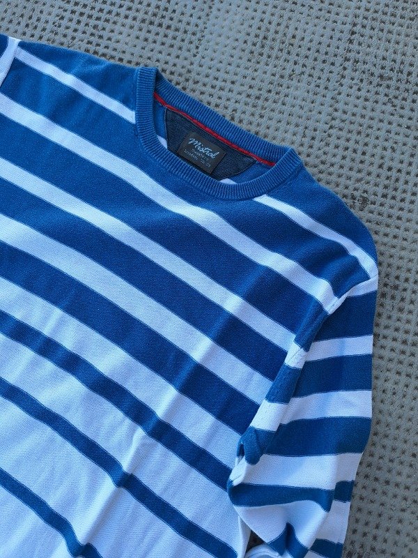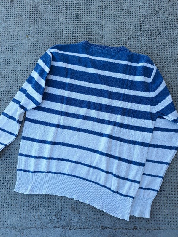 𝗗𝗲𝘀𝗰𝗿𝗶𝗽𝗰𝗶𝗼𝗻: Sweater de líneas en tono azul y blanco, sweater práctico para el día a dia, o formalizaron con algún saco o chaqueta.