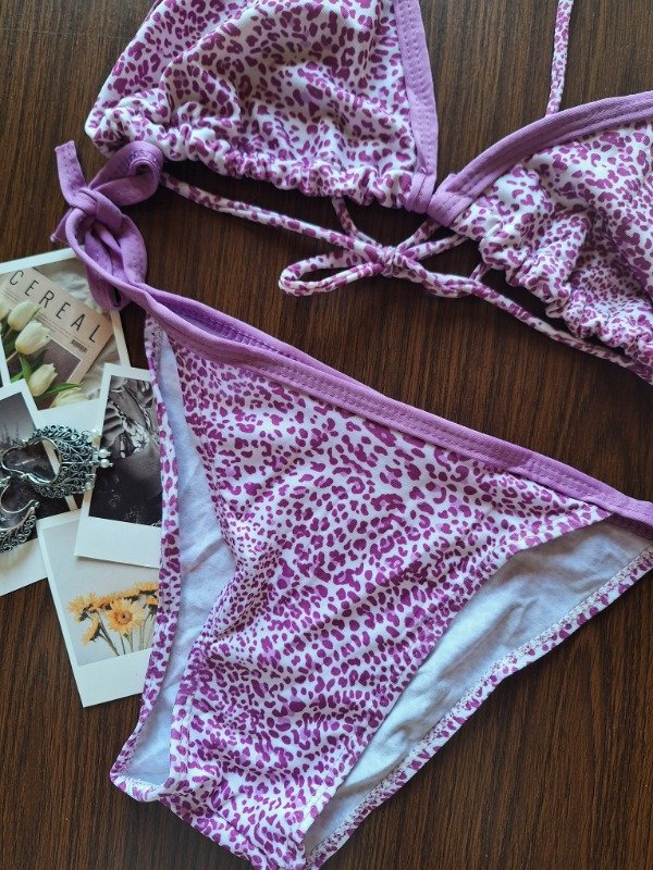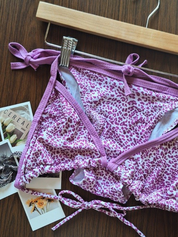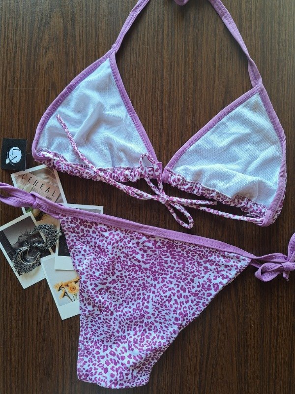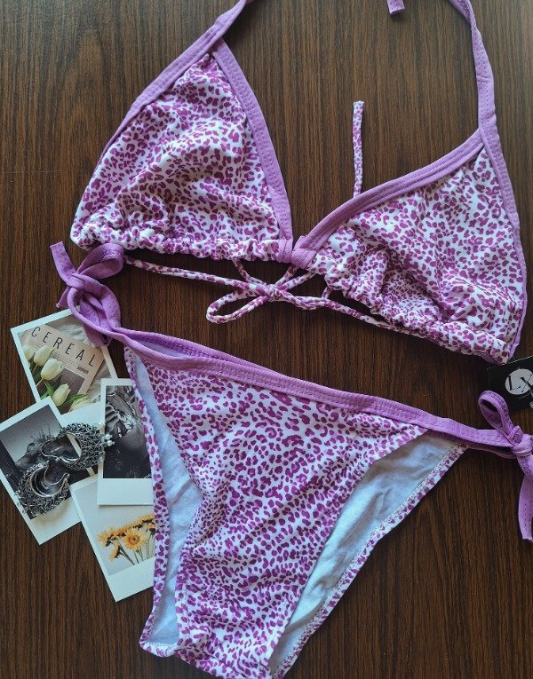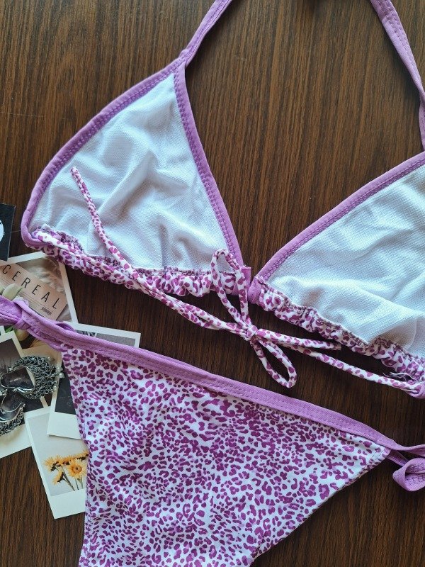Bikini a conjunto en un estampado animal print color lila y violeta.