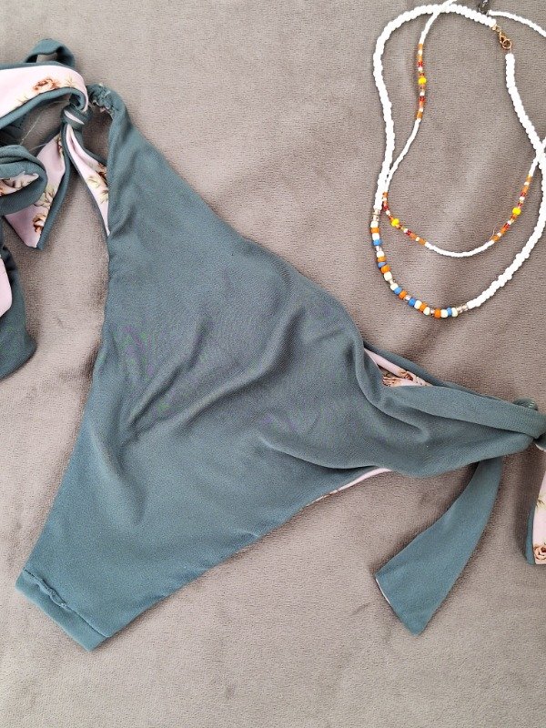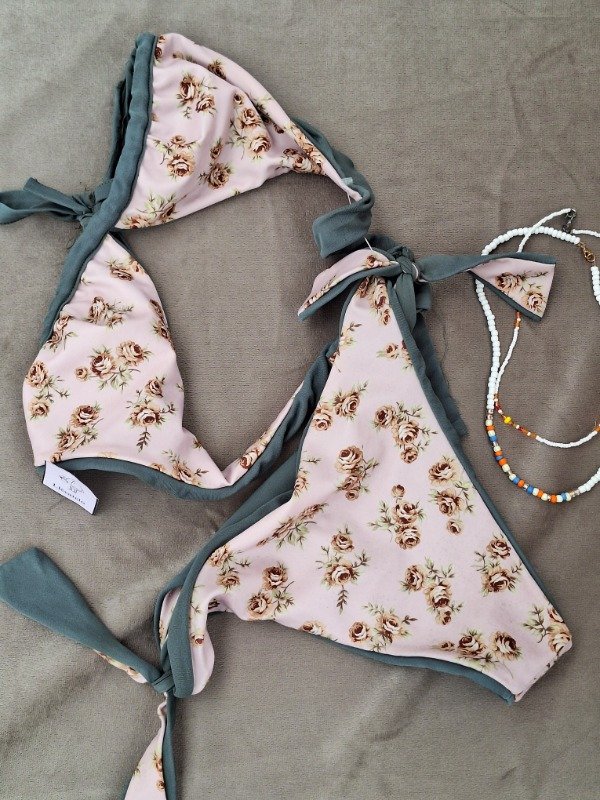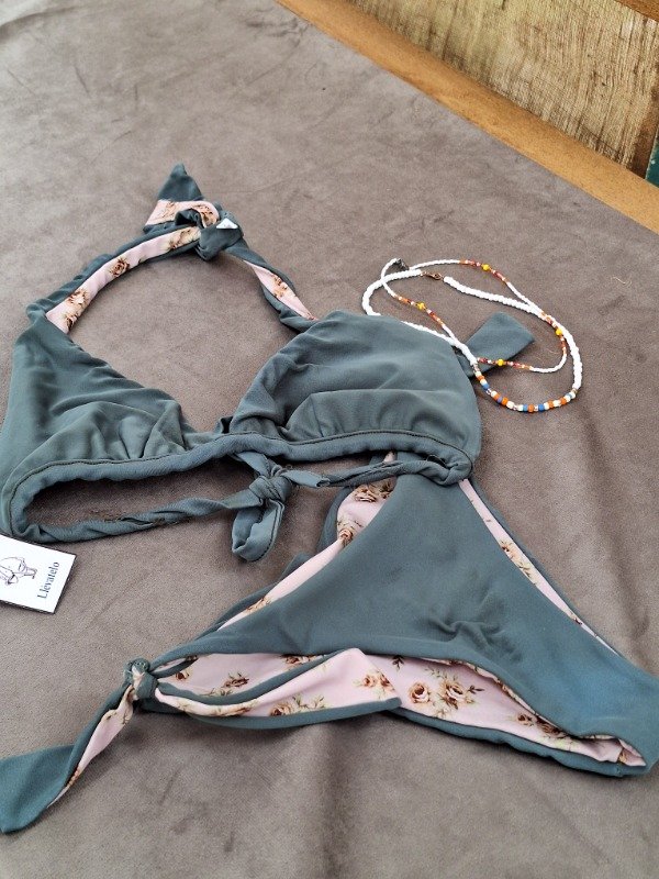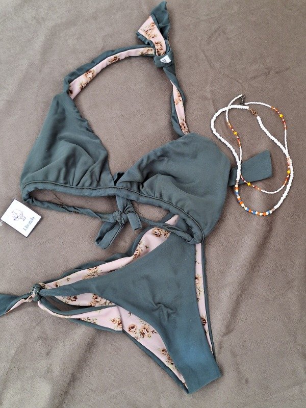 𝗗𝗲𝘀𝗰𝗿𝗶𝗽𝗰𝗶𝗼𝗻: Bikini verde oliva reversible a un tono rosa viejo con flores, es una Bikini preciosa! Modelo vedetina, parte superior triangulo. Estado 7 de 10 porque la tela ya está algo estirada.