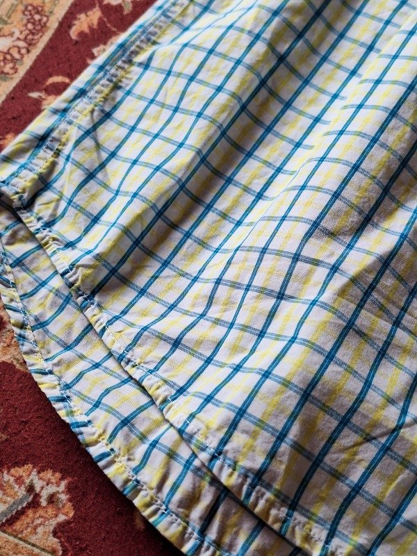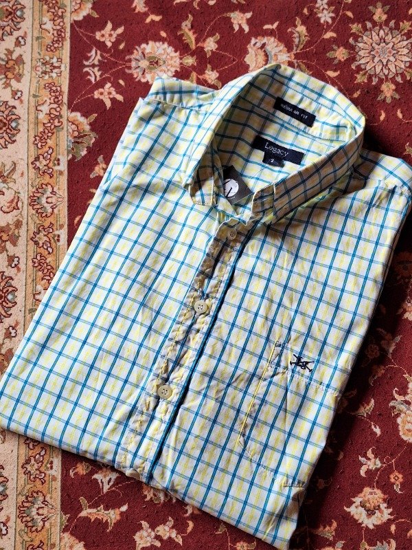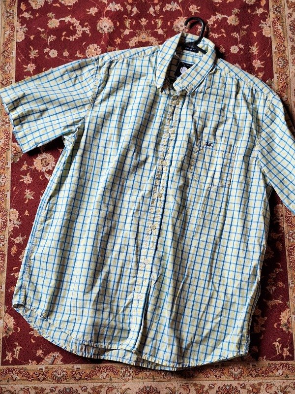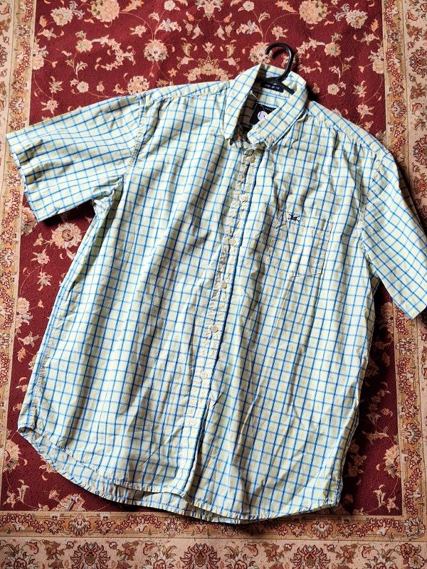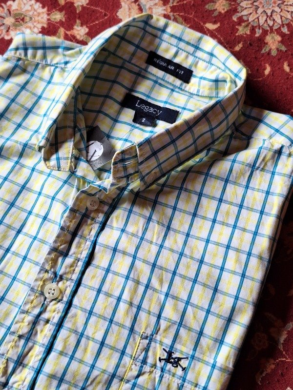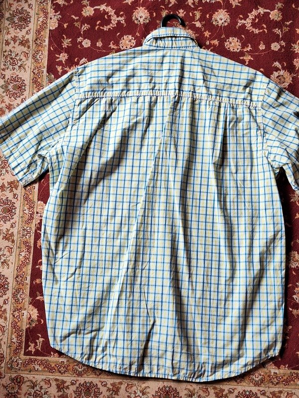 𝗗𝗲𝘀𝗰𝗿𝗶𝗽𝗰𝗶𝗼𝗻: Camisa a cuadros en tonos claritos, con líneas en celeste y amarillo, como nueva, bolsillo pequeño por delante, modelo manga corta. Con dos botones de repuesto en la etiqueta