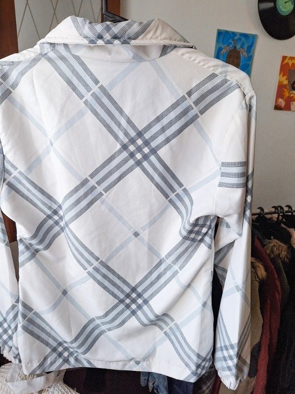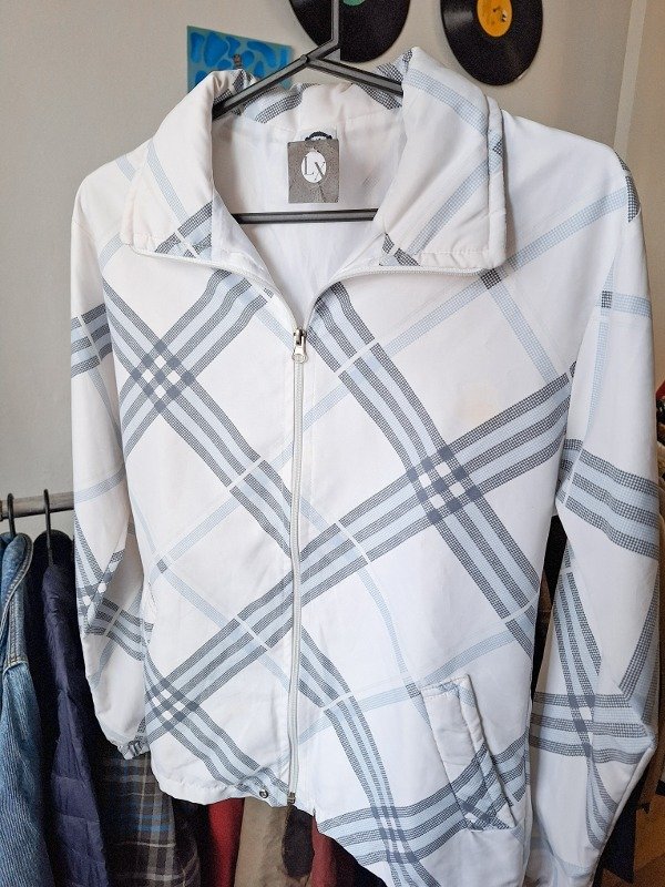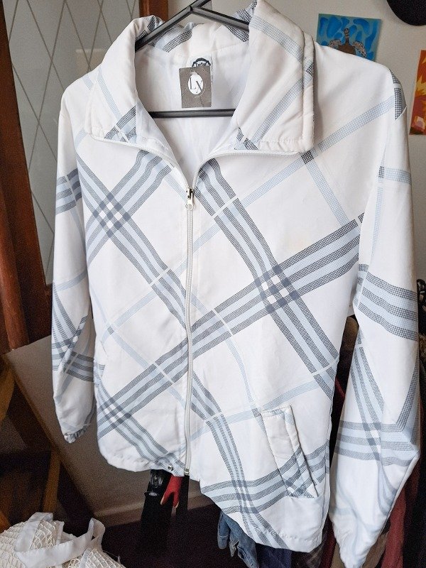 𝗗𝗲𝘀𝗰𝗿𝗶𝗽𝗰𝗶𝗼𝗻: Campera deportiva blanca con líneas en tono celeste hermoso, con bolsillos, muy cómoda y practica para el día a día, con una pequeña marchita en el pecho, a simple vista no se ve, pero esta.