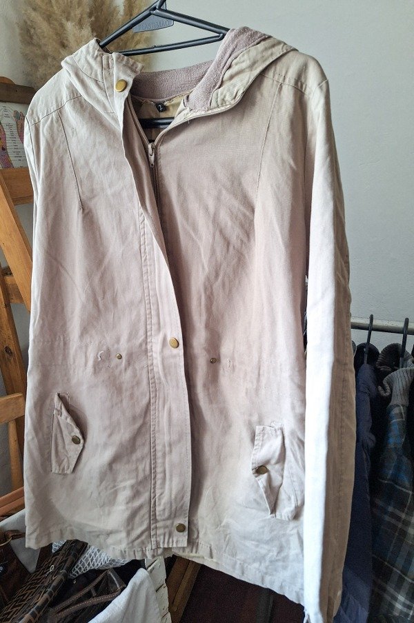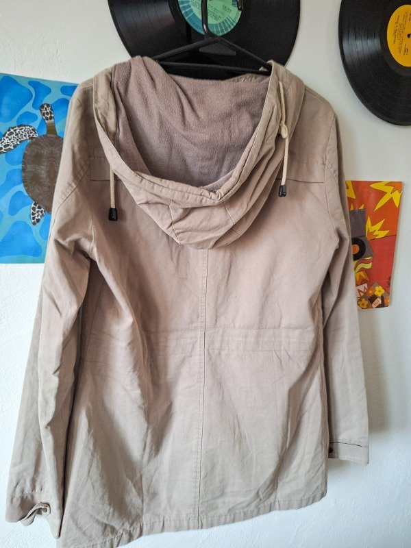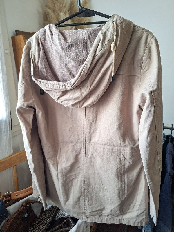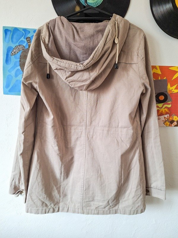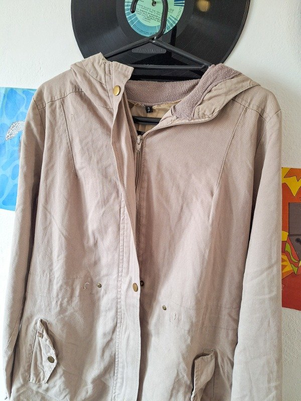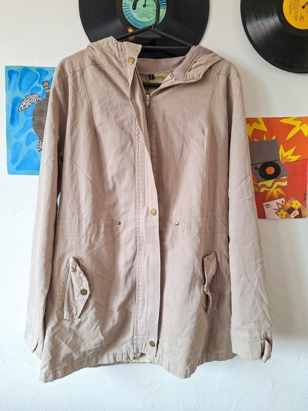 𝗗𝗲𝘀𝗰𝗿𝗶𝗽𝗰𝗶𝗼𝗻: Parka beige lisa con capucha, modelo clásico y muy versátil para el día a días, finita práctica para los días de humedad.