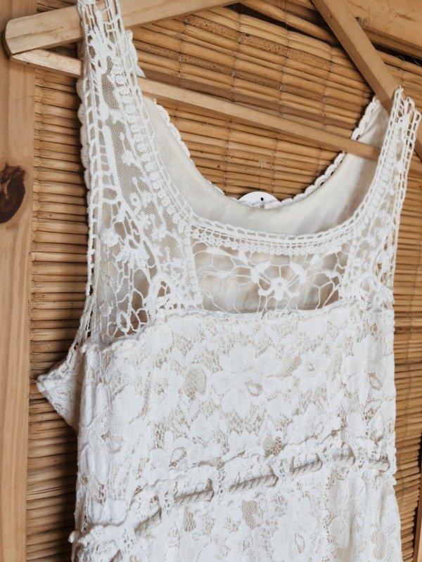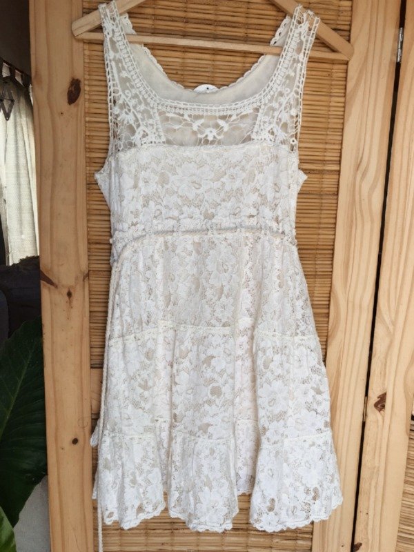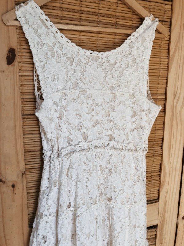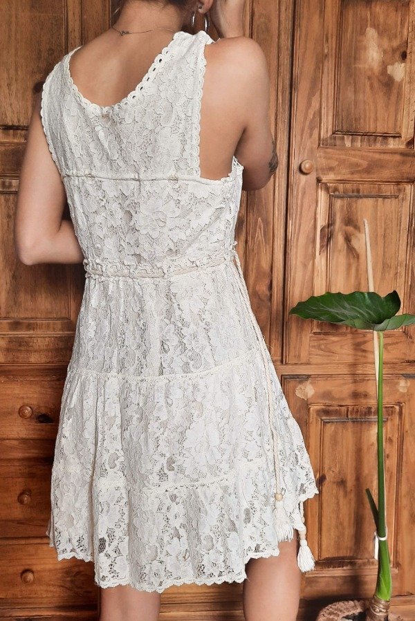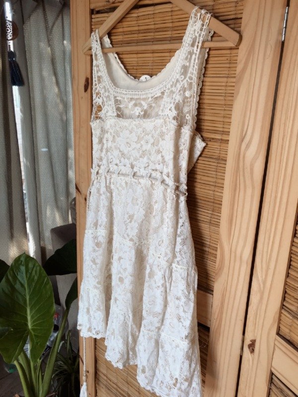 𝗗𝗲𝘀𝗰𝗿𝗶𝗽𝗰𝗶𝗼𝗻: Vestido color crema de encaje, precioso vestido delicado con su soga en la cintura para ajustar al cuerpo.