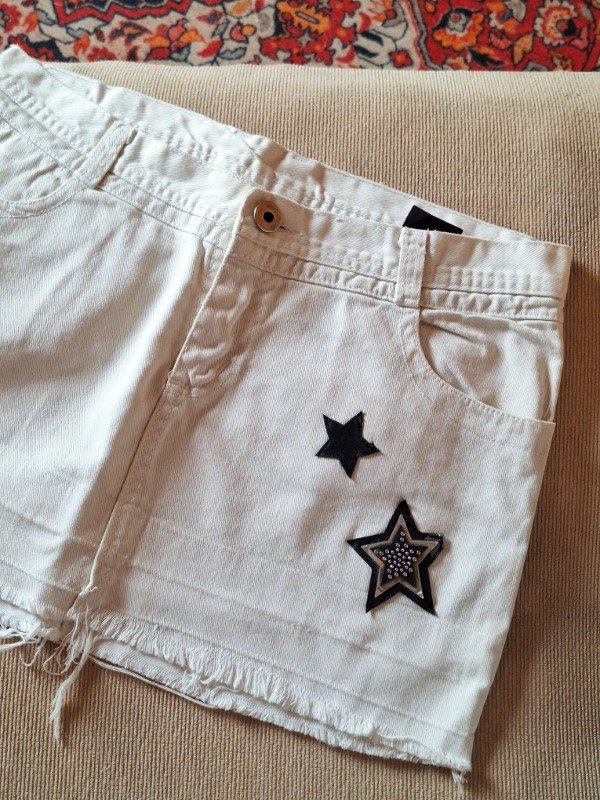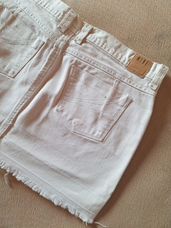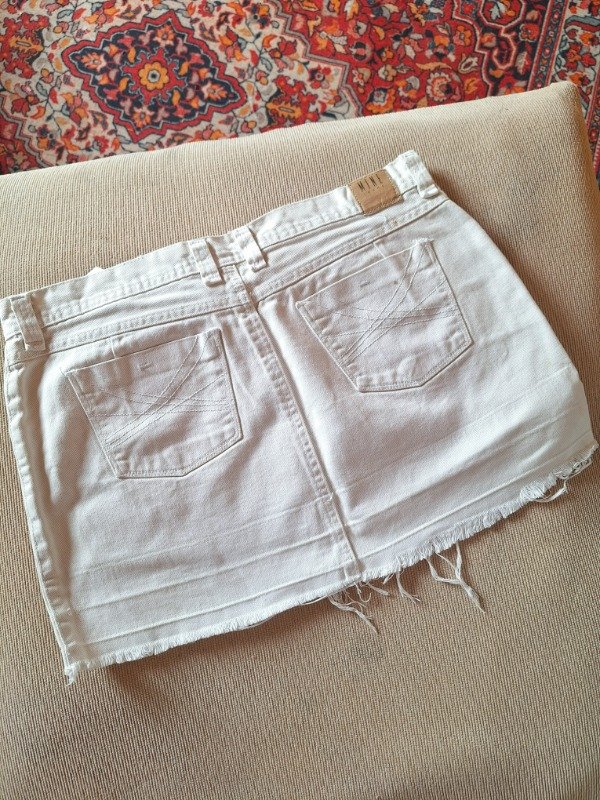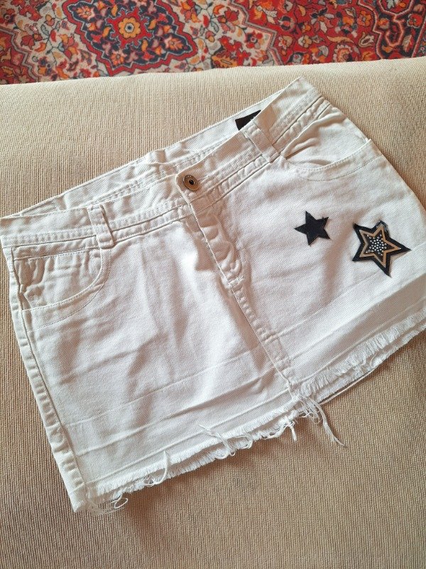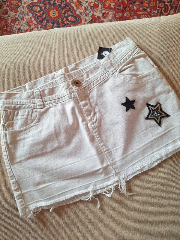 𝗗𝗲𝘀𝗰𝗿𝗶𝗽𝗰𝗶𝗼𝗻: Mini blanca clásica, con dos estrellas que la hacen versátil para la noche también, termina en flecos, bolsillos adelante y atrás, tiro bajo.