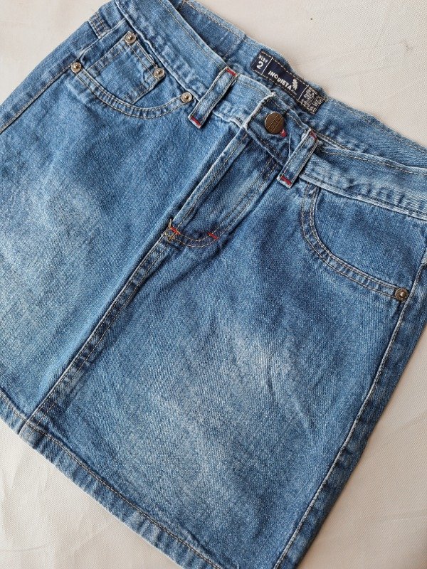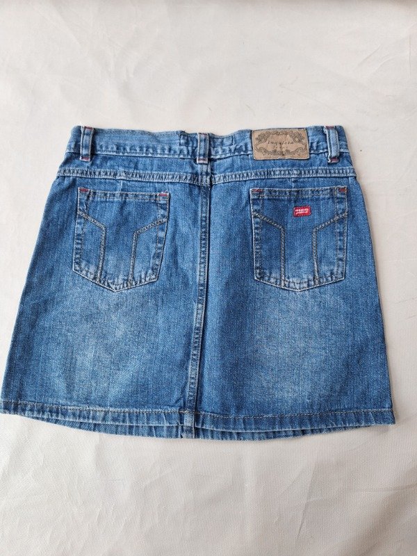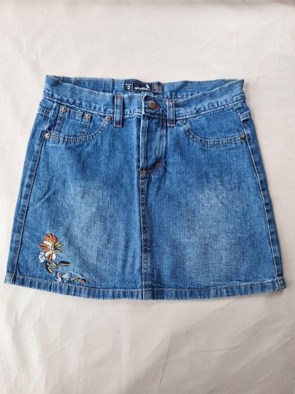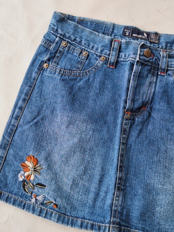 𝗗𝗲𝘀𝗰𝗿𝗶𝗽𝗰𝗶𝗼𝗻: Pollera de jeans azul, con una flor bordada a uno de los lados, bolsillos solo atrás.
