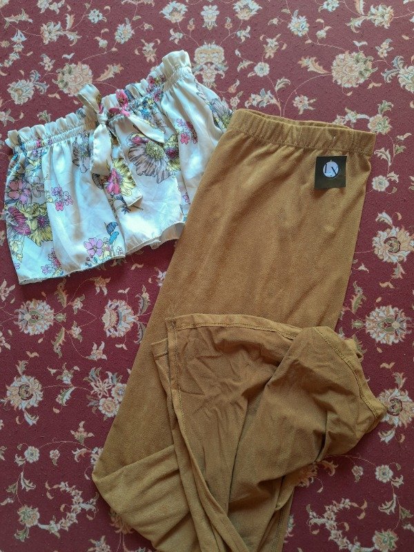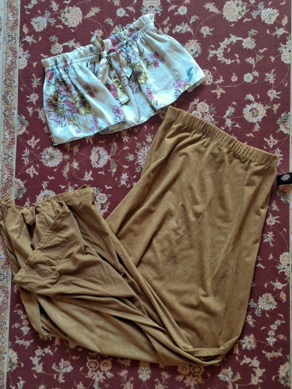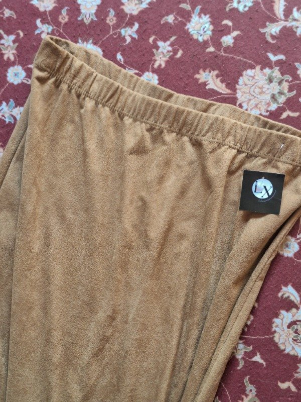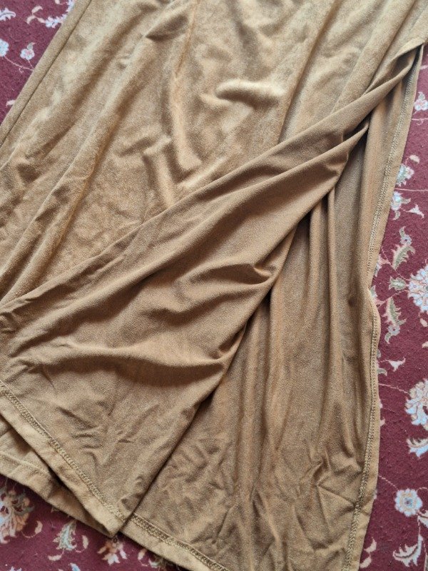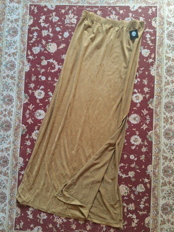 𝗗𝗲𝘀𝗰𝗿𝗶𝗽𝗰𝗶𝗼𝗻: Pollera color dulce de leche, con aberturas a los lados hasta la altura de la rodilla. Elástico en la cintura.