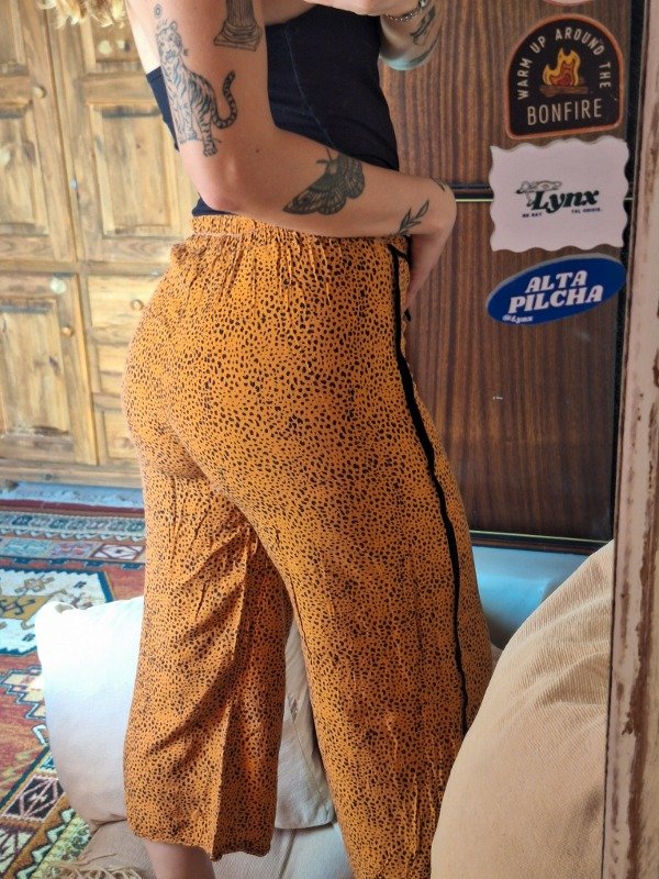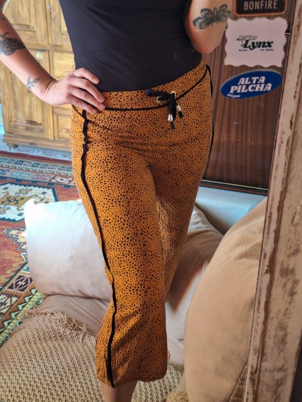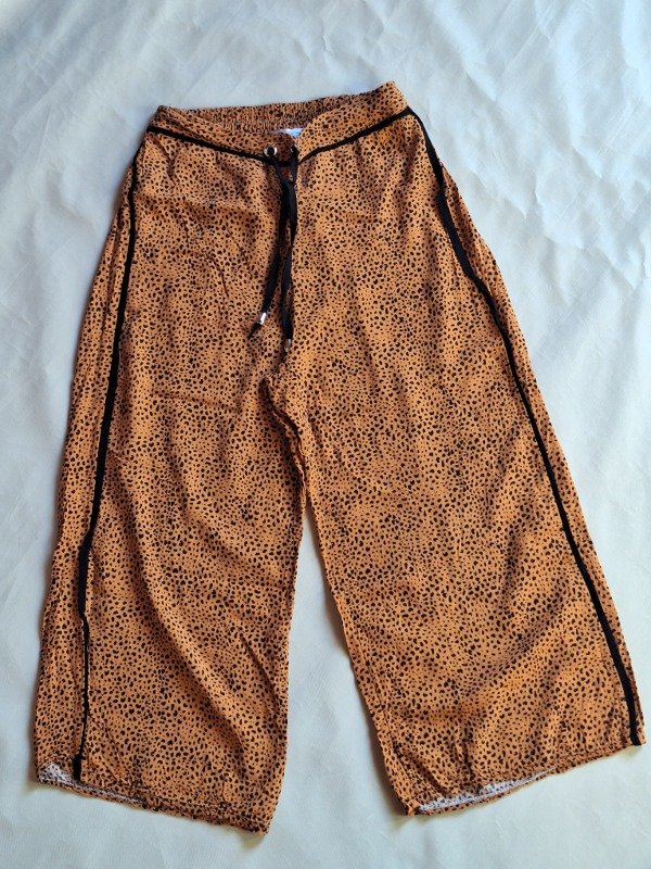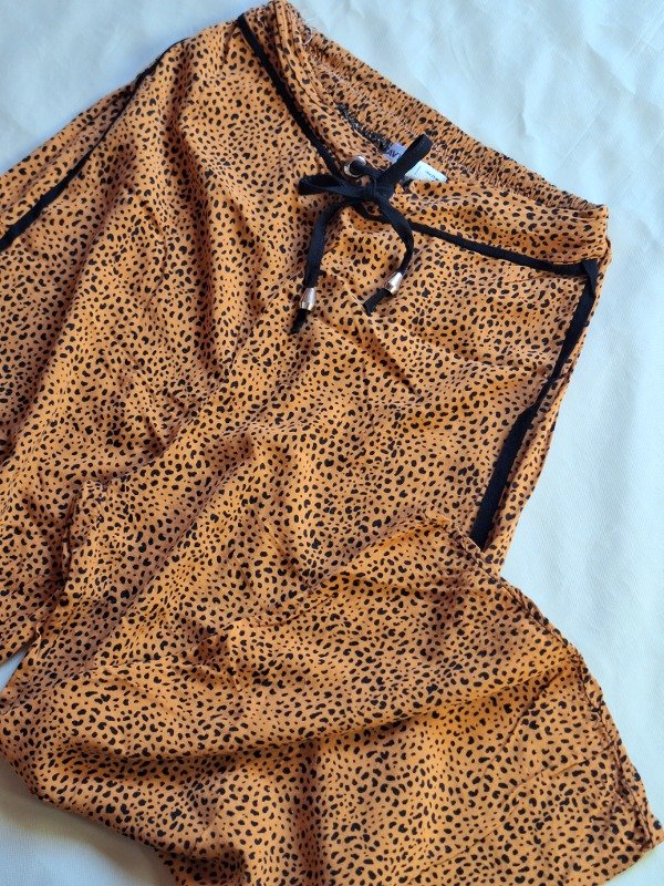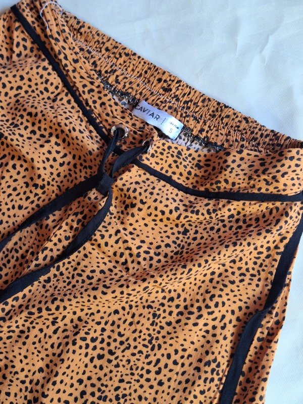 𝗗𝗲𝘀𝗰𝗿𝗶𝗽𝗰𝗶𝗼𝗻: Pantalón de fribrana, estampado animal print, el tono es como un dulce de leche anaranjado, es precioso y único! Tiro alto con cintura elastizada en la parte de atrás, es pescador recto.