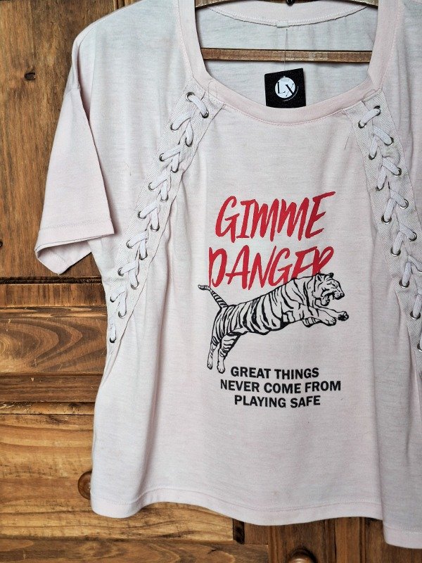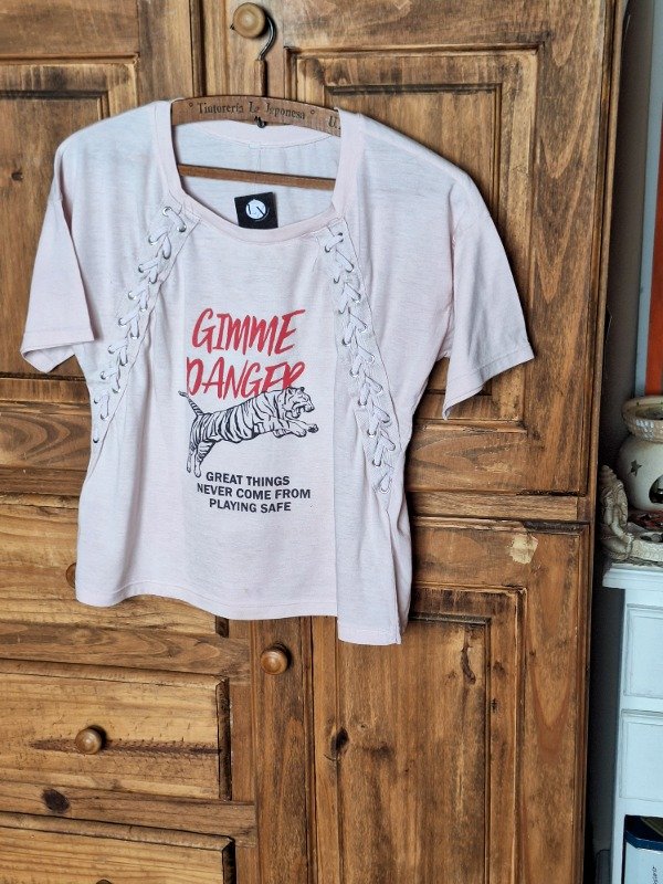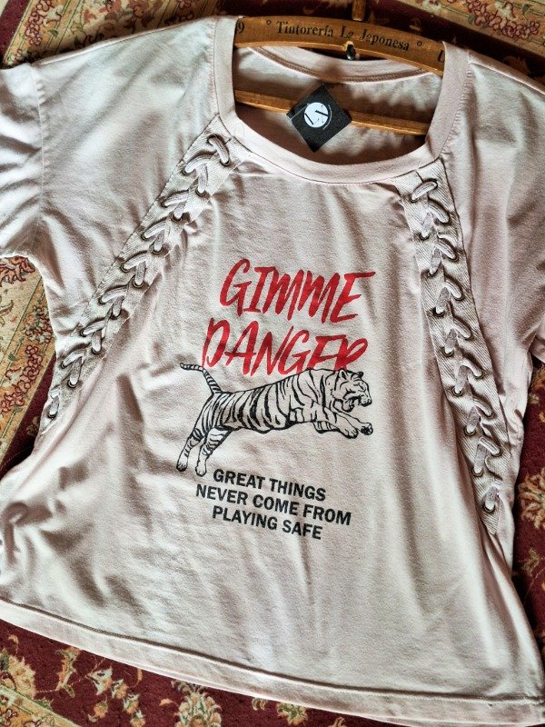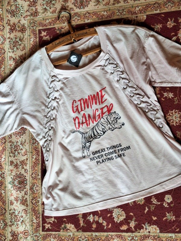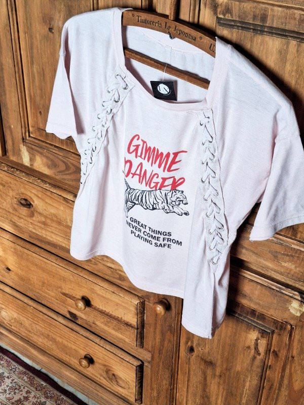 𝗗𝗲𝘀𝗰𝗿𝗶𝗽𝗰𝗶𝗼𝗻: Hermosa remera para todos los días, en tono rosa pastel con trenzas de cordón en diagonal, estampa de tigre.