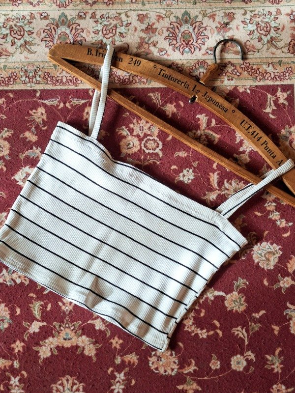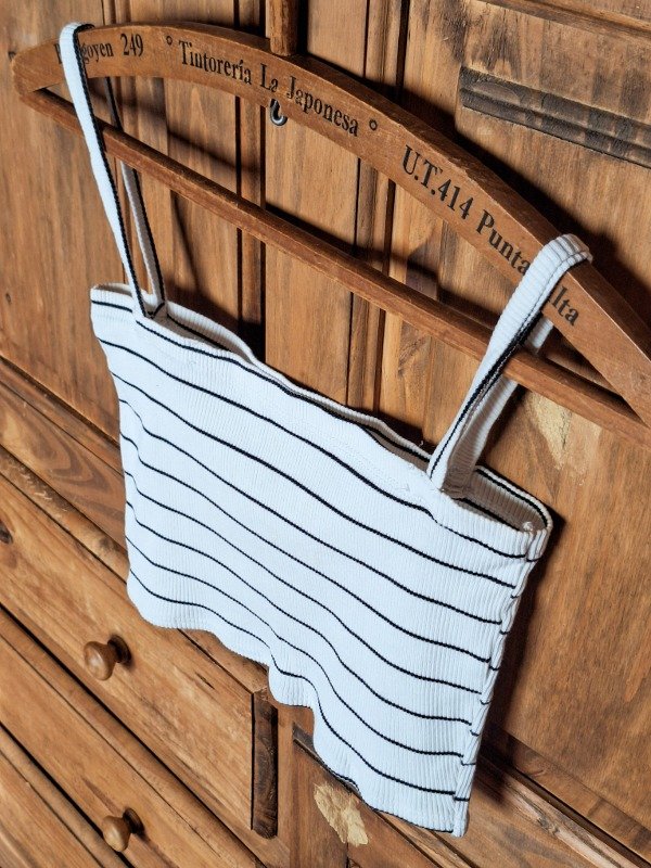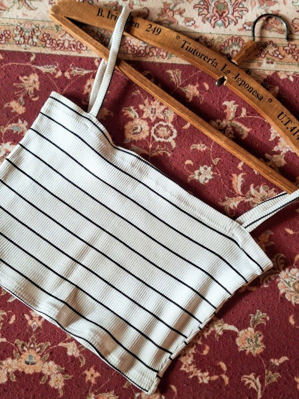 𝗗𝗲𝘀𝗰𝗿𝗶𝗽𝗰𝗶𝗼𝗻: Top blanco con líneas negras, precioso para todos los días o oufits más arreglados, super practico.