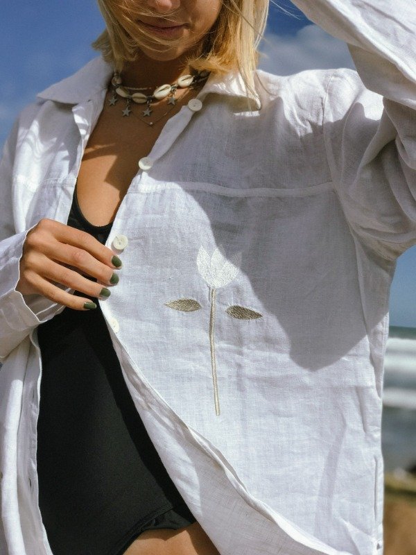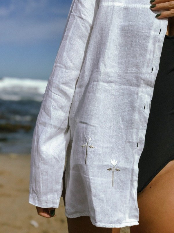 𝗗𝗲𝘀𝗰𝗿𝗶𝗽𝗰𝗶𝗼𝗻: Camisa blanca, con hermoso bordado de flores, botones blancos, las mangas son rectas no llevan botón y pequeñas aberturas a los lados para completar el modelo. Muy hermosa.