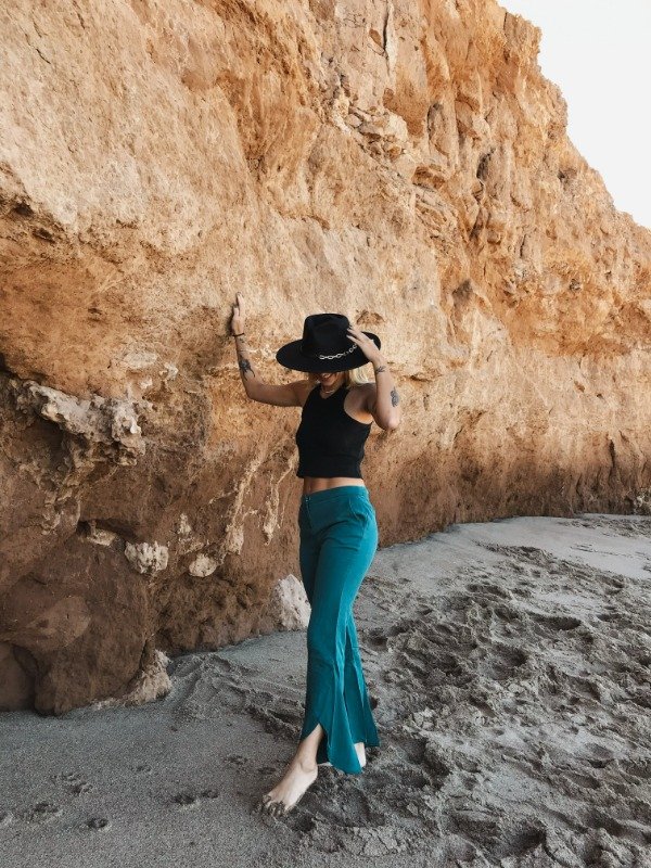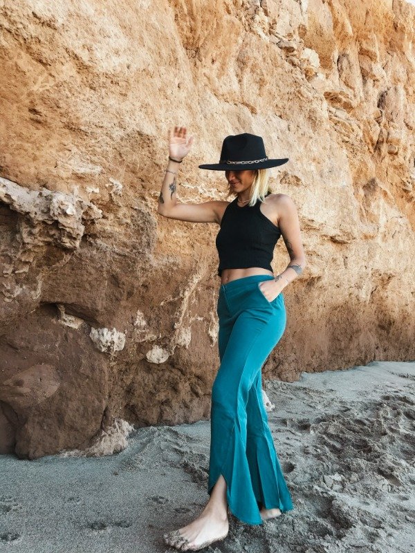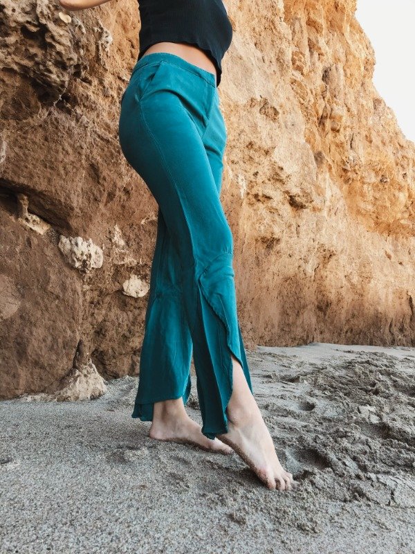 𝗗𝗲𝘀𝗰𝗿𝗶𝗽𝗰𝗶𝗼𝗻: Pantalon verde petróleo, con bolsillos adelante, y bolsillos falsos corte chino atrás, este modelo es hermoso por el volado abierto al final del pantalón.