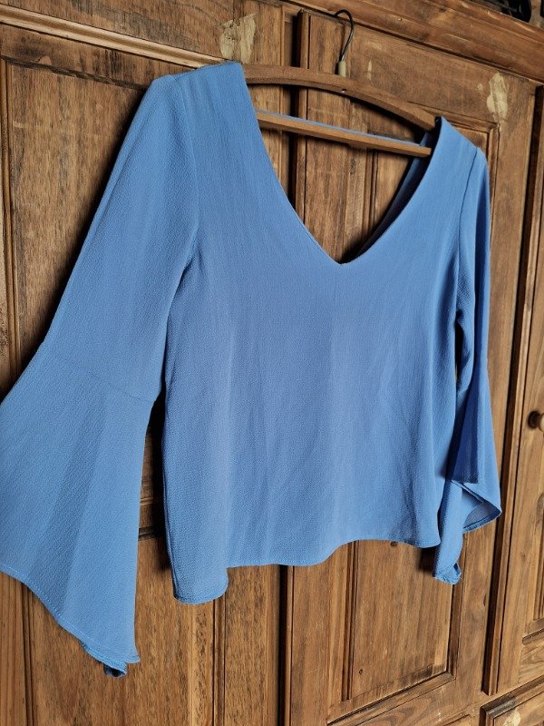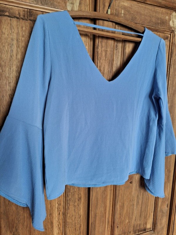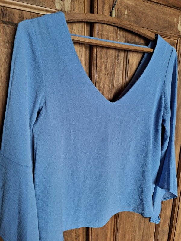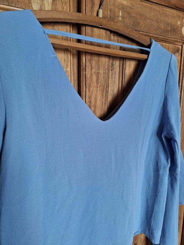𝗗𝗲𝘀𝗰𝗿𝗶𝗽𝗰𝗶𝗼𝗻: Blusas celeste pastel con escote en V pronunciado, tanto por delante como por detras, mangas oxford con picos.