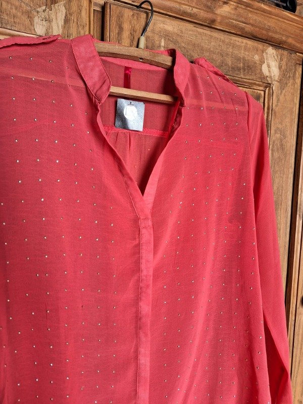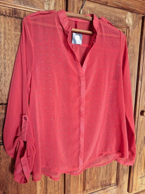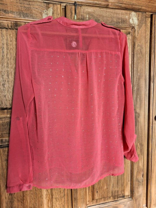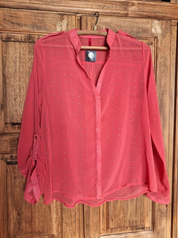 𝗗𝗲𝘀𝗰𝗿𝗶𝗽𝗰𝗶𝗼𝗻: Camisita transparente rosa con brillitos, escote en V, bien fresquita ideal para la primavera.