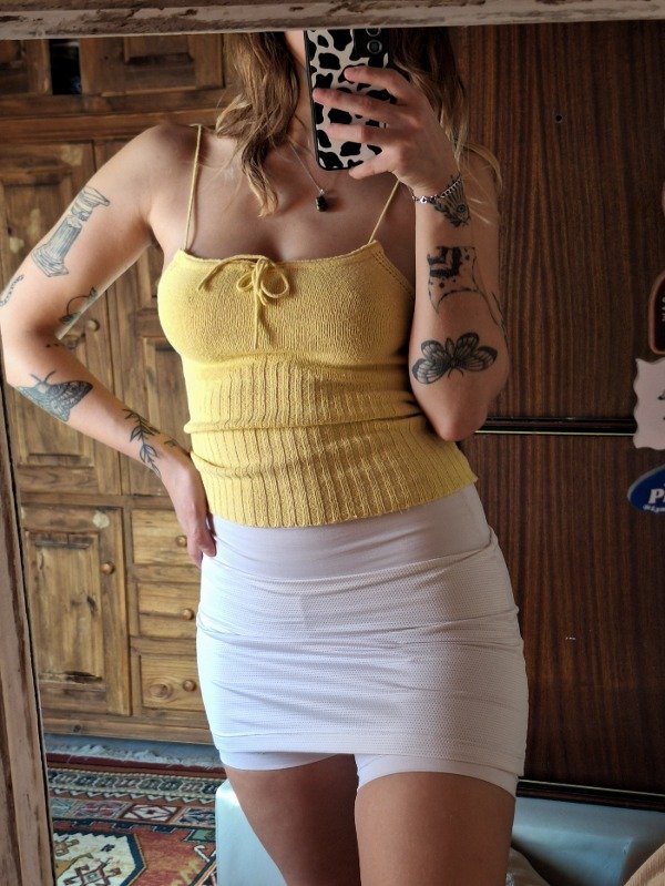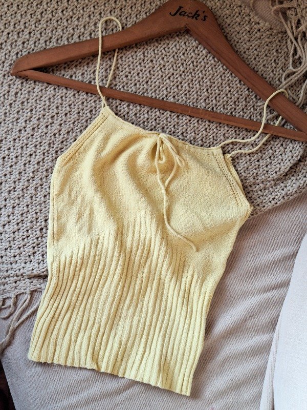 𝗗𝗲𝘀𝗰𝗿𝗶𝗽𝗰𝗶𝗼𝗻: Top amarillo pastel, de hilo al cuerpo, con un hilo en el torso que se le puede ajustar, un modelo de costura qué hace el diseño estilo corset.