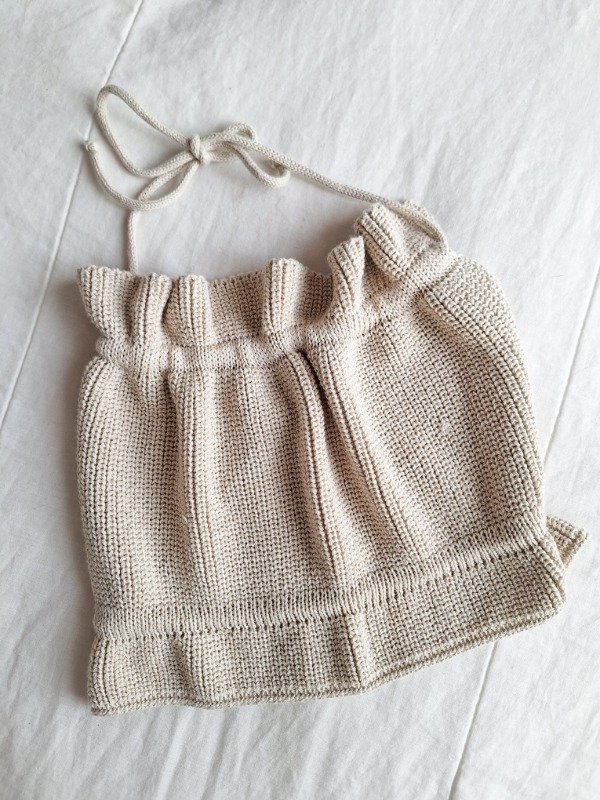 𝗗𝗲𝘀𝗰𝗿𝗶𝗽𝗰𝗶𝗼𝗻: Top de hilo en tono beige, tiene una tirita para que uno lo ajuste a su medida, sede hasta un L aproximado..